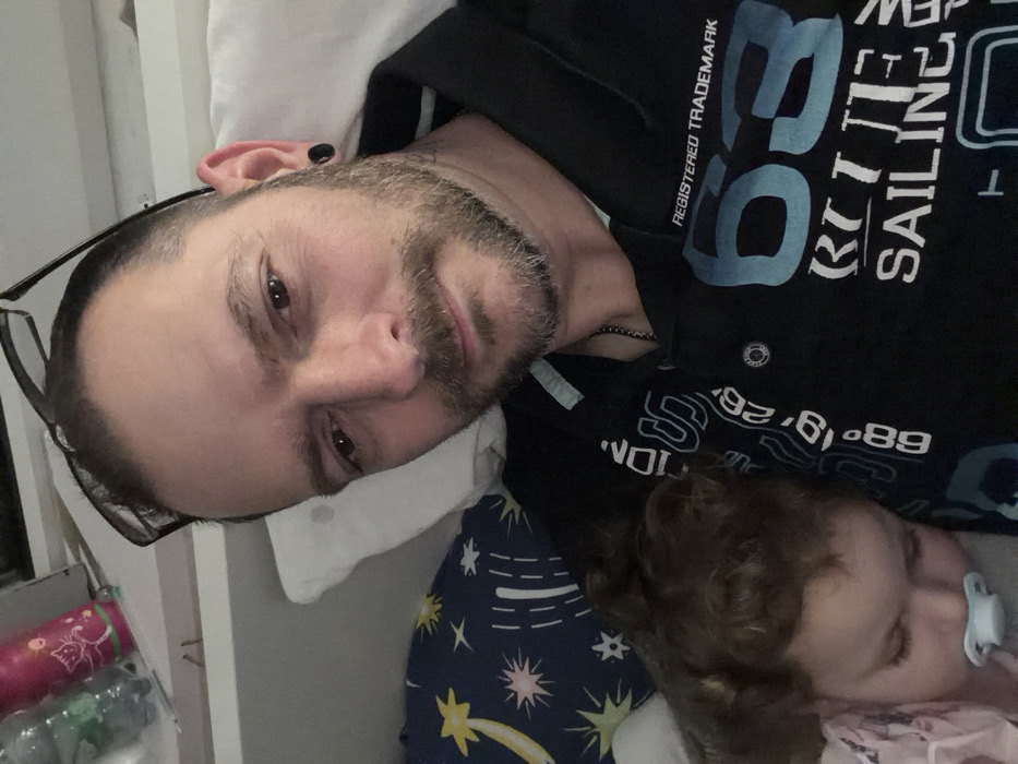 This indoor scene, located in Trassem, Germany, depicts an adult male and a young child in a relaxed setting, likely a bed or couch. The adult male, positioned centrally and to the right, has short, dark hair, a full beard, and is wearing eyeglasses on his head and a dark polo shirt with light blue and white graphics. He has a black ear gauge in his left ear and a silver chain around his neck. He looks directly at the camera with a slight smile. A young child, with curly reddish-brown hair, is visible in the lower-left, appearing to sleep with eyes closed and a light blue pacifier in its mouth. The child is wearing a light pink garment and rests on a dark blue pillow adorned with white and yellow star patterns. A white pillow supports the adult's head. In the background, on an elevated surface to the upper left, a green plastic bottle and a pink insulated bottle with a white graphic are present.
