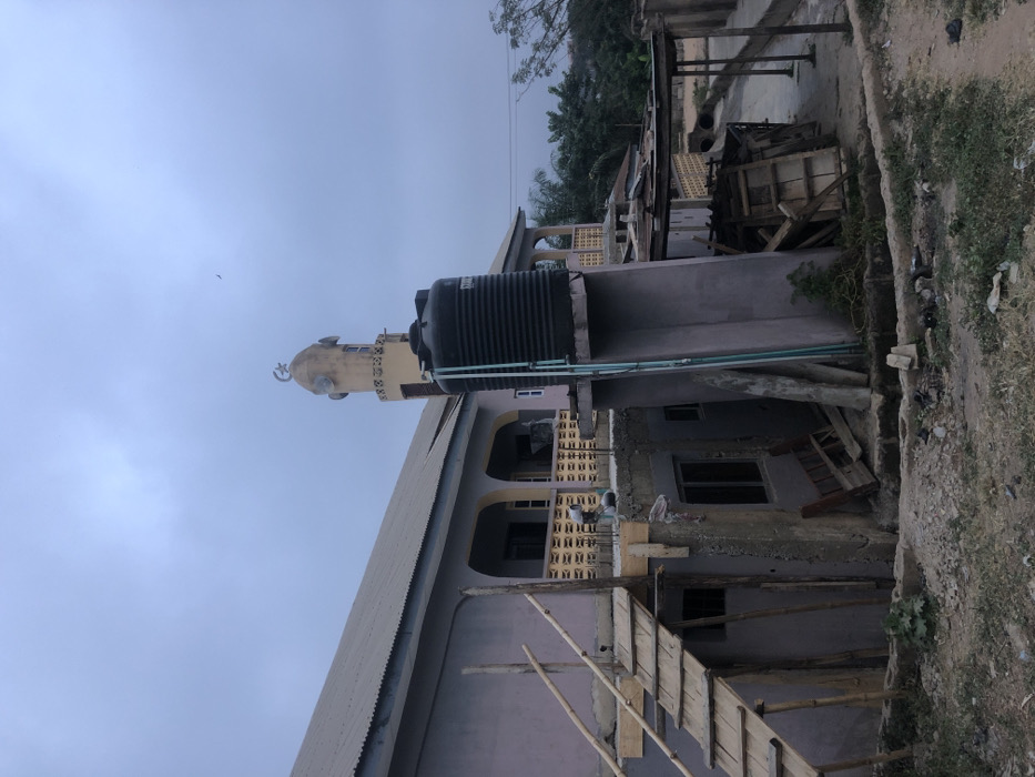 A mosque's minaret pierces a cloudy sky. A large, black water tank sits atop the building, connected by green pipes. The structure appears to be under construction, with scaffolding and wooden planks visible. A pile of debris and building materials clutters the ground nearby. Trees and vegetation surround the mosque, creating a contrast between the natural and built environment.