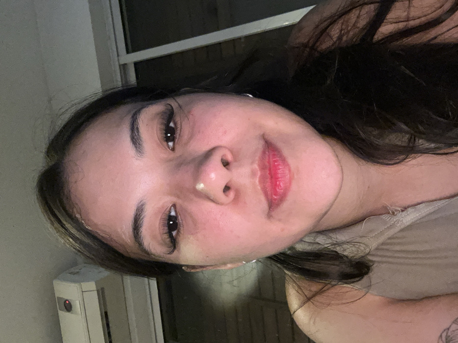 A woman's face dominates the frame, slightly tilted and angled upwards. She has dark hair with some lighter strands, dark eyes with noticeable eyelashes, and a small nose. Her lips are tinted a reddish-pink. The skin appears fair and slightly flushed. A white, possibly metallic, object is visible in the lower left corner, with what looks like a window with blinds in the background. The woman wears a light tan top, exposing part of her shoulder.