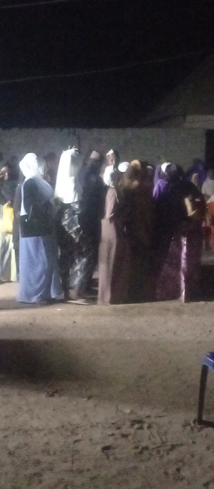 A gathering of individuals outside at night. Most of them are wearing long dresses or skirts, and some have head coverings. The clothing is in various colors including light blue, white, purple, and brown. The setting appears to be a yard or open area, possibly at a community event, given the casual arrangement of people. A chair is partially visible in the foreground.