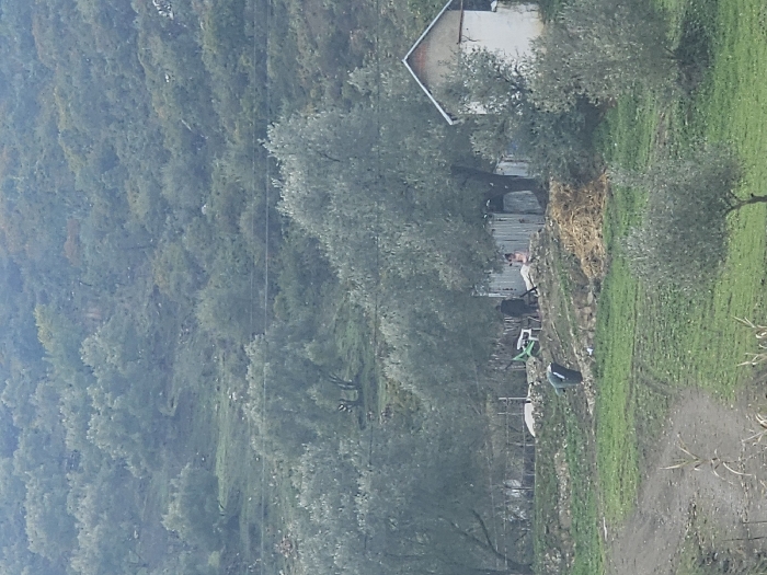 The image depicts a rural scene in Moqrisset, Morocco, characterized by a hilly, verdant landscape under an overcast sky. The terrain is densely covered with olive trees and other low-lying green vegetation. A dirt track, visible in the lower left foreground, meanders through a grassy area. In the midground, a small, single-story building with white walls and a light-colored, sloped roof is situated on the right. To its left, a corrugated metal fence or structure encloses an area. Four individuals are present near this enclosure. One individual, dressed in dark clothing, is bent over in the lower-center midground, appearing to engage with the ground, possibly performing agricultural work. Behind this individual, a pile of light-brown organic material, consistent with hay or straw, is visible. Further back, near the corrugated metal structure, three other individuals are observed. One person in dark attire is seated near a green plastic chair. Another individual, wearing light-colored clothing (possibly pink or orange), is seated behind the metal structure. A third person is partially obscured within this seated group. No direct interactions between the individuals are discernible. The background consists of steep, tree-covered hills.