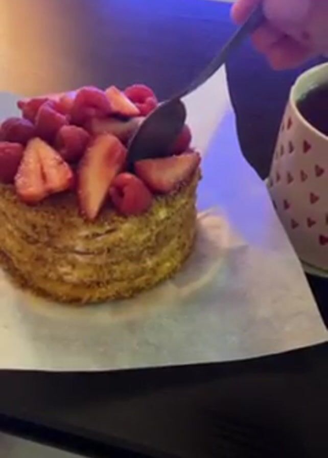 A person is using a spoon to cut into a small cake. The cake is layered and frosted, topped with fresh raspberries and sliced strawberries. It rests on a sheet of parchment paper on a dark surface. To the right, there’s a white mug decorated with pink hearts.