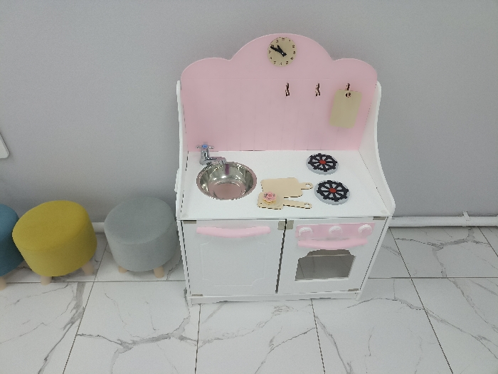 The scene depicts a child's play kitchen set and three small stools within an indoor area in Serpukhov, Russia