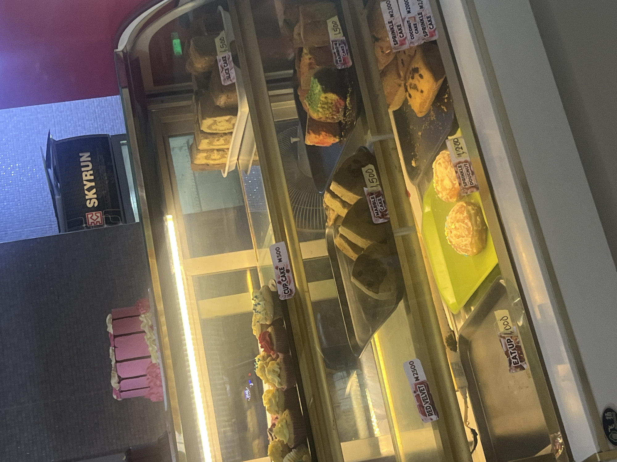 - "refrigerated display case filled with various pastries, including sliced cake, rainbow cake, marble cake, cupcakes, red velvet cake, and sprinkle doughnuts, with associated price tags in Nigerian Naira (₦)" by FM-2J6ky1, licensed under CC BY 4.0