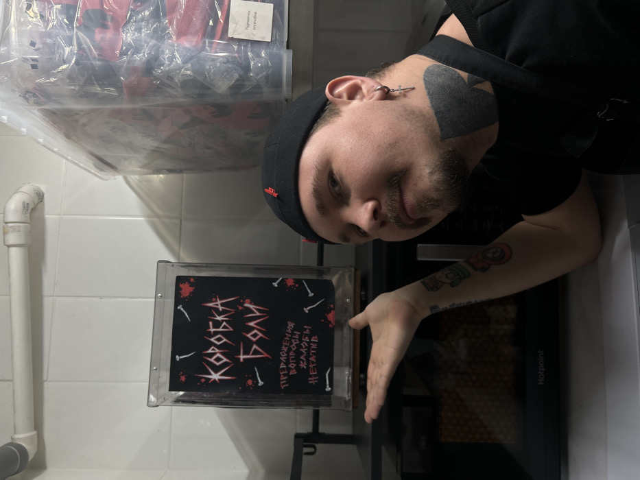 The scene is set in an indoor commercial utility or kitchen area, identified as Unknown, United States, featuring white tiled walls and a horizontal white PVC pipe near the ceiling. A black Hotpoint microwave oven occupies the mid-ground on a dark surface. Above the microwave, a clear acrylic box, approximately 25cm tall, displays a black sign. The sign features red stylized Cyrillic text reading "КОРОБКА БОЛИ" (Box of Pain) at the top, with additional white Cyrillic text below stating "ПРЕДЛОЖЕНИЯ ВОПРОСЫ ЖАЛОБЫ НЕГАТИВ" (Suggestions Questions Complaints Negative), all adorned with red splatters and white nail graphics. To the right of the box, a large, clear plastic storage container holds red items. A male individual, appearing to be in his 30s, is positioned on the right side of the frame. He wears a black beanie with red accents, a black t-shirt, and a black apron. He has a mustache, a goatee beard, a prominent black tattoo on his throat, colorful tattoos on his left forearm, and a silver hoop earring with a cross pendant in his left ear. He is looking directly at the camera with a slight smirk, presenting the "Box of Pain" with his open left hand while his right arm rests on the microwave.