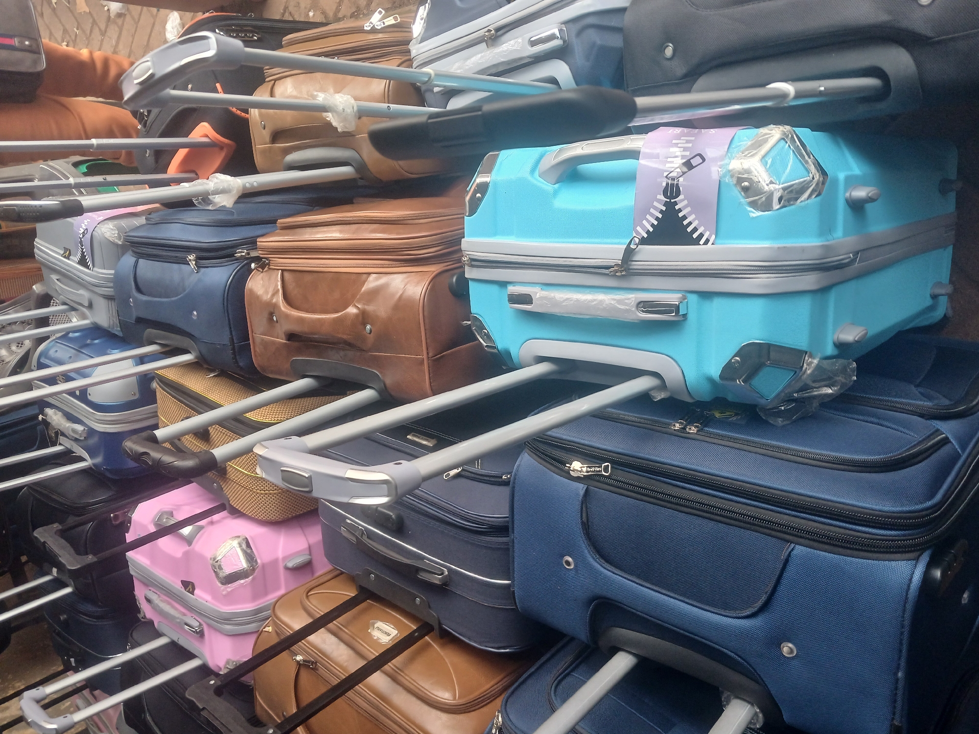 The image displays a dense collection of approximately two dozen new suitcases and travel bags, tightly packed and stacked, suggesting a retail display within an unknown city's market stall or shop. The luggage varies in color, including navy blue, royal blue, black, pink, light blue/teal, and brown, and comprises both soft-sided fabric and hardshell designs. Many items feature extended or partially extended metallic telescopic handles, some still wrapped in protective plastic. One light blue hardshell suitcase is notable for a distinctive purple and white zipper-design luggage tag and a plastic-wrapped luggage lock. In the upper right quadrant, the lower body of a person wearing orange-brown trousers is partially visible, standing amidst the luggage. The immediate environment includes what appears to be a light brown paved or brick ground surface beneath the items.