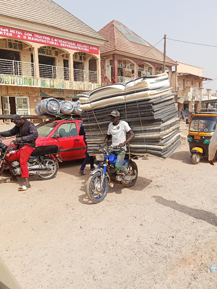 The image displays a daytime street scene in a commercial district of Tudun Nupawa, Nigeria, featuring an unpaved, dusty road. In the foreground, a male individual, dressed in a white t-shirt, patterned trousers, and a cap, operates a blue motorcycle that is heavily laden with a tall, rectangular stack of approximately 20-25 foam mattresses, alternating between black/dark grey and white/light grey layers, secured by multiple ropes. To the left, a second male, wearing a dark jacket and red trousers, is seated on a red motorcycle, which is stationary. Between these two motorcycles, a red four-door sedan is parked, its roof burdened with several horizontally stacked, cylindrical objects, possibly gas cylinders, secured with green ropes. A third individual's legs are partially visible near the rear passenger side of the red car. On the far right, a yellow three-wheeled tuk-tuk is partially visible, with a person's limb near it. The background features multi-story buildings with tiled roofs; one prominent building displays a large sign reading "S4N METAL CON TRUCTION & INTERNATIONAL SECURITY DOORS IMPORTER A D MANUFACTURAL REPRESENTATIVES." Another building to its right has solar panels installed on its roof. The scene is brightly illuminated, casting distinct shadows on the ground.