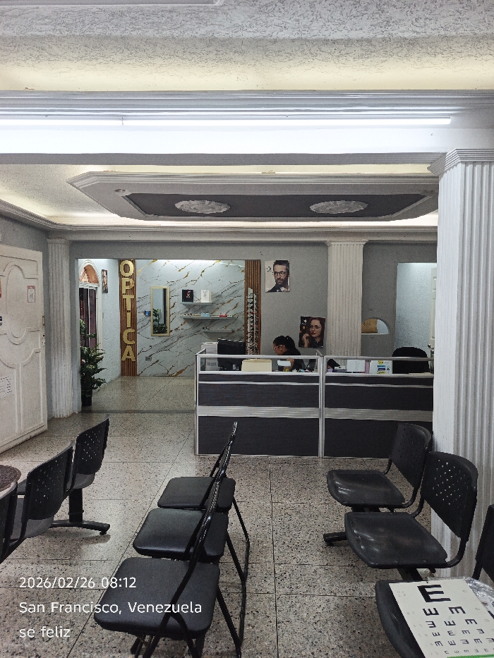 This image depicts the interior waiting and reception area of an optical store or clinic, located in San Francisco, Venezuela, captured on 2026/02/26 at 08:12