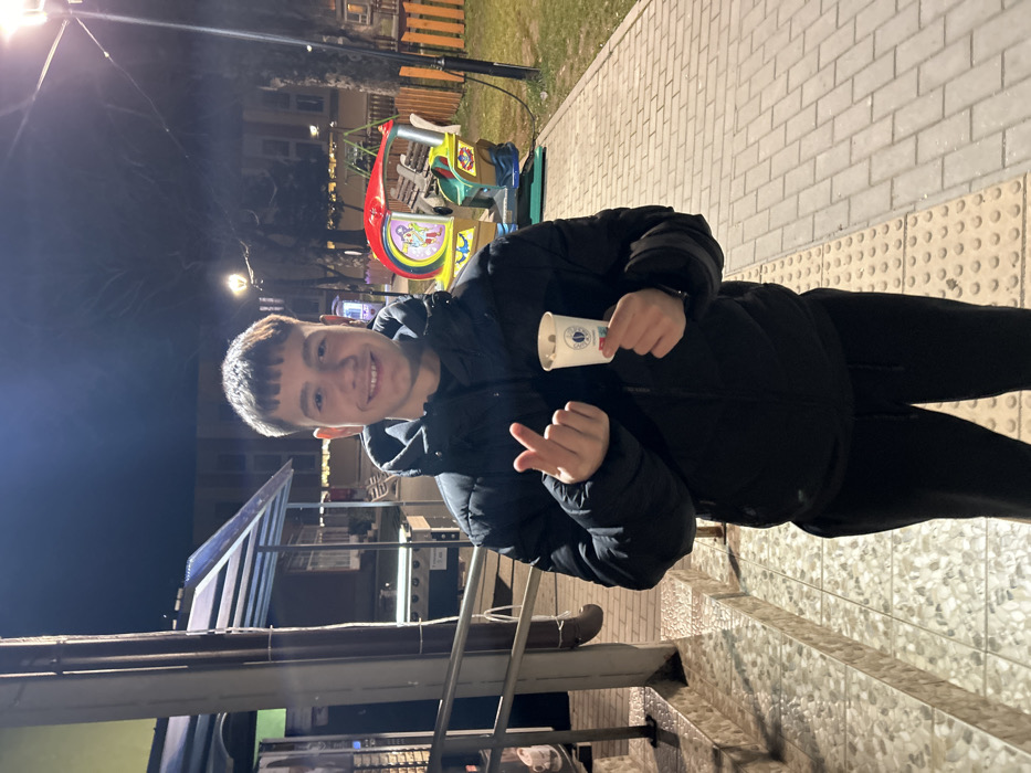 A young male individual stands outdoors at night in Mezdra, Bulgaria, illuminated by artificial light. He is positioned on a paved walkway, with a section of mosaic-tiled stairs to his left and a grassy area to his right. The male has short, dark hair and is smiling, showing his teeth. He wears a dark, possibly black, puffer jacket and dark sweatpants. His left hand is raised, forming a small heart gesture with his thumb and index finger. His right hand holds a small, white paper cup containing a light-colored beverage, possibly topped with sprinkles, and featuring a blue logo. In the background, to the right, a coin-operated children's ride, red and yellow, is visible on the grass. To the left, behind the male, is a structure with a translucent corrugated roof, appearing to be part of a kiosk or outdoor stall with metal counters. Distant buildings with illuminated windows and bare trees are visible under a dark night sky. Multiple streetlights provide illumination to the scene. The paved walkway consists of light-colored rectangular pavers, with a tactile paving strip in the immediate foreground.