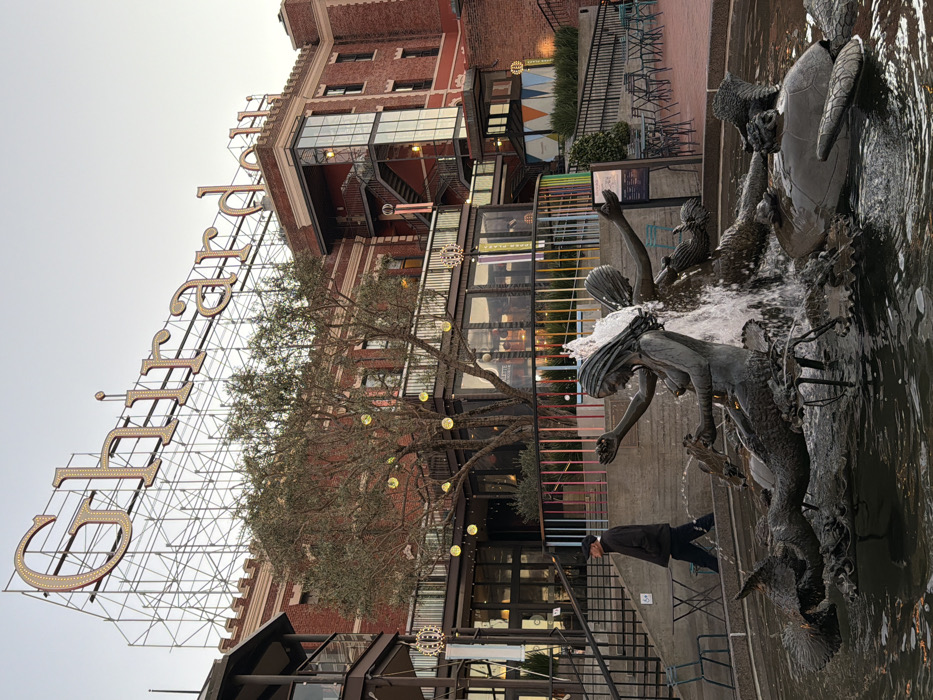 A bustling urban scene features a towering building adjacent to the iconic "Ghiredelli" sign. A fountain with sculptural figures cascades water into a pool, while a tree decorated with orbs stands nearby. A man walks past a bistro set, creating a sense of movement in the otherwise static composition. The sky is overcast, contributing to the urban atmosphere.