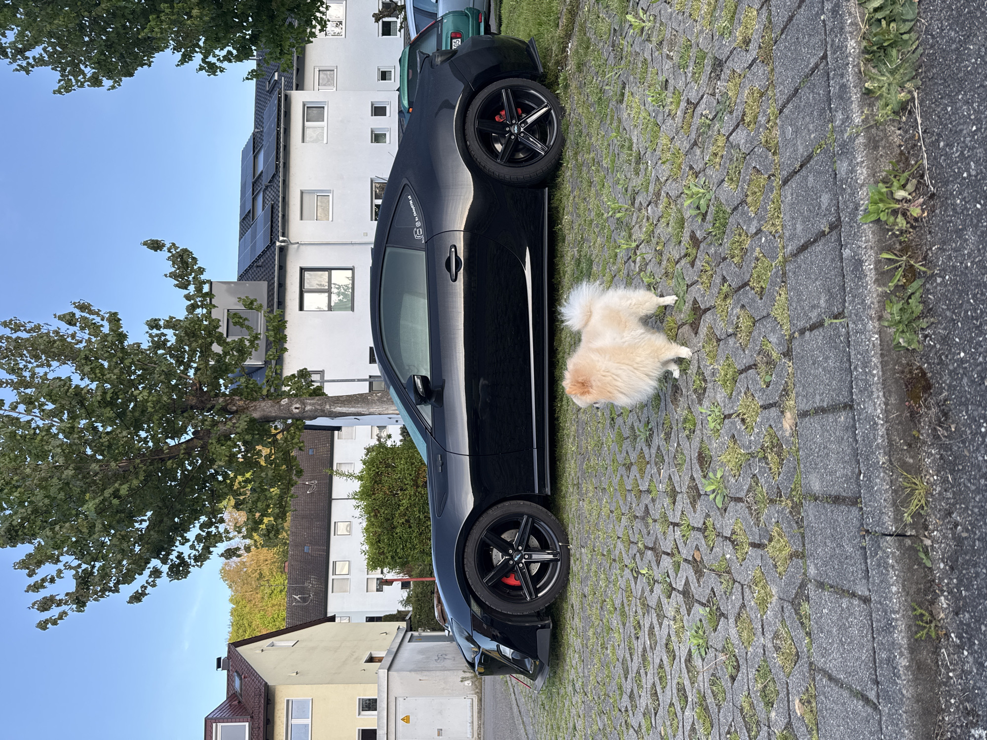 The image depicts a black coupe parked on a paved area with grass growing through the gaps in Bietigheim-Bissingen, Germany. A light-colored Pomeranian dog is standing near the car. Buildings and trees are visible in the background under a clear sky.