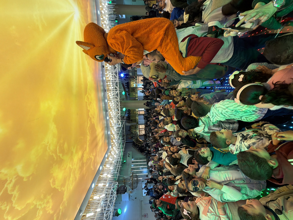 The image depicts a crowded indoor event, likely a children's gathering, in an Unknown location within Gaza City. The scene is dominated by a large assembly of individuals, predominantly children, filling the foreground and extending into the background, where a balcony area is also populated. In the central foreground, an individual dressed in a full-body orange mascot costume, resembling a fox or similar creature with large green eyes and a black nose, is seated on the shoulders of an adult male. The mascot appears to be holding a black object, possibly a camera or microphone, to its face. The adult male supporting the mascot wears a white garment with red sleeves and dark trousers. Partially visible to the left of the orange mascot is another, less distinct mascot figure with a light-colored head. The children in the crowd are varied in age, estimated between 5 and 12 years old, and are actively looking towards the central figures. One child in the immediate foreground has black face paint resembling a mask around their eyes. Another individual in a green hoodie on the left side of the mid-ground holds a small Turkish flag. The floor of the venue appears reflective, showing reflections of green and blue stage lighting. The ceiling of the venue is a striking feature, displaying a large backlit or projected image of a vibrant, cloudy sky in shades of golden yellow and orange, suggesting a sunset or sunrise. Suspended below the ceiling, along the perimeter of the room and extending towards the center, are numerous decorative light fixtures, resembling strands of crystals or icicles. A visible metal truss system supports additional stage lighting, emitting green and blue beams. In the background, a staircase leads to the upper balcony level where more attendees are visible.
