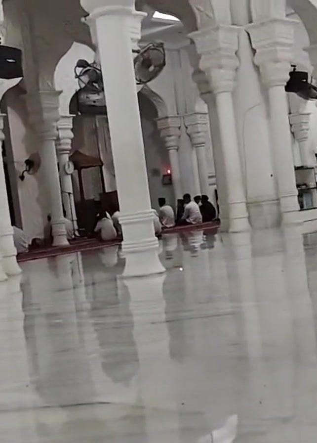 interior of a white mosque. Several men are sitting on red prayer rugs, engaged in prayer or meditation. The mosque features rows of white pillars with ornate capitals, supporting arches. The floor is a shiny, reflective surface, likely marble, mirroring the pillars and figures. There are fans attached to the pillars. The scene is bathed in a soft, diffused light.