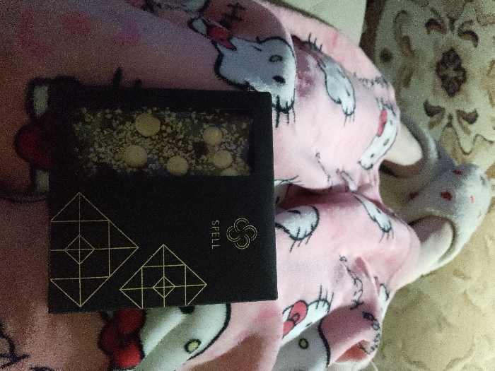 A black box with gold geometric designs and the word "SPELL" rests on a pink Hello Kitty patterned fabric. A window in the box reveals a bar of chocolate covered in white dots and other toppings. The fabric is soft and fuzzy. Part of a beige patterned surface is in the background.