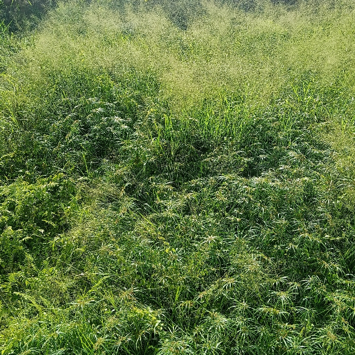 This image depicts a densely overgrown natural landscape located in Cipanas, Indonesia. The scene is composed entirely of various green vegetations under ambient daylight. In the foreground and midground, a mix of flora is visible, including broad-leafed plants resembling ferns, taller grass-like stalks, and numerous smaller plants with leaves radiating from a central point. The background transitions into a lighter green, fine-textured expanse of vegetation, consistent with wild grasses or weeds, potentially in bloom or seed. No individuals, artificial objects, or activities are present within the frame.