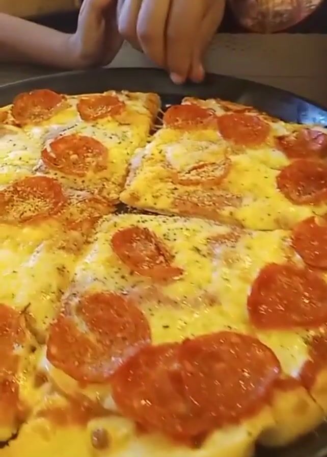 A close-up video shows two people, presumably a child and an adult, sitting at a wooden table and taking slices of a pepperoni pizza from a black metal tray