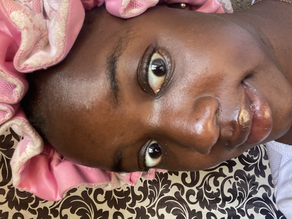 An individual with dark skin is depicted in a close-up, head-and-shoulders portrait, presumably taken indoors in Sabon Tasha, Nigeria. The person is wearing a pink satin-like head covering with a ruffled edge featuring white lace detail. A small, round gold stud earring is visible in the right earlobe. The eyes are wide open, pupils appear dilated, and a reflection is present in both dark irises. The individual has full lips, adorned with a light metallic or gold-colored lip gloss or lipstick, and exhibits a slight smirk or smile. A white garment is visible below the chin. The background consists of a dark brown or black fabric or wallpaper with an ornate, light-colored damask-style pattern.