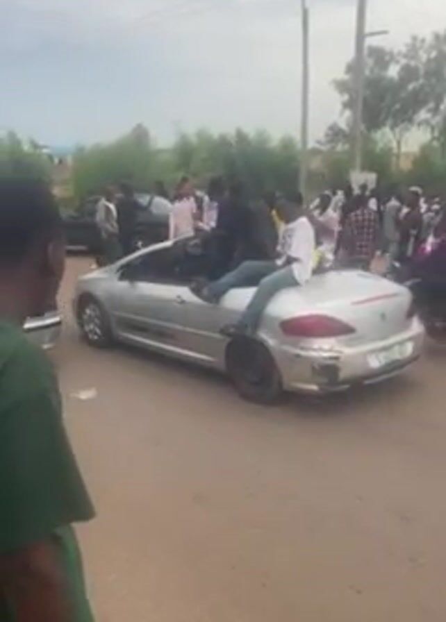 silver Peugeot convertible stopped in the middle of a dirt road. There are three people in the car and several people standing around it. The people in the car are sitting on the seats and on the trunk. The people on the ground are standing around and watching the car. The road is lined with buildings and trees. There is a man in a green shirt in the foreground, facing away from the camera.