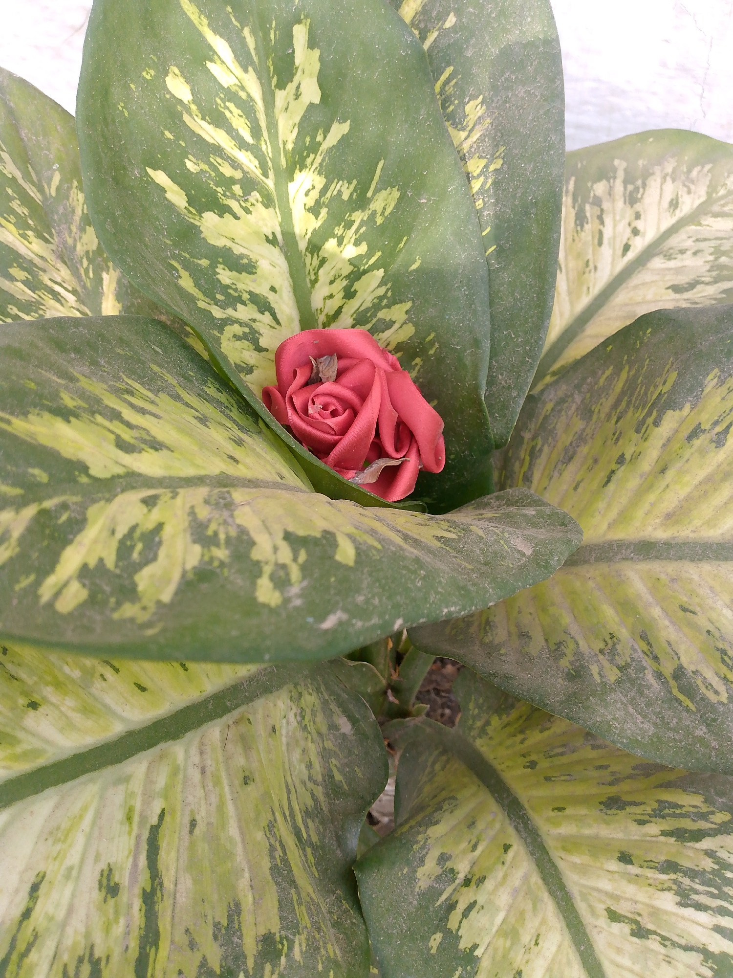 A close-up shot depicts a dieffenbachia plant with large, ovate leaves exhibiting variegated patterns of green and yellow. A single, small red rose sits nestled within the leaves, seemingly placed there artificially. The leaves appear dusty, suggesting the plant may be kept indoors or in a sheltered outdoor location. There is no indication of the location of Juan Griego, Venezuela. There are no people visible in the image.