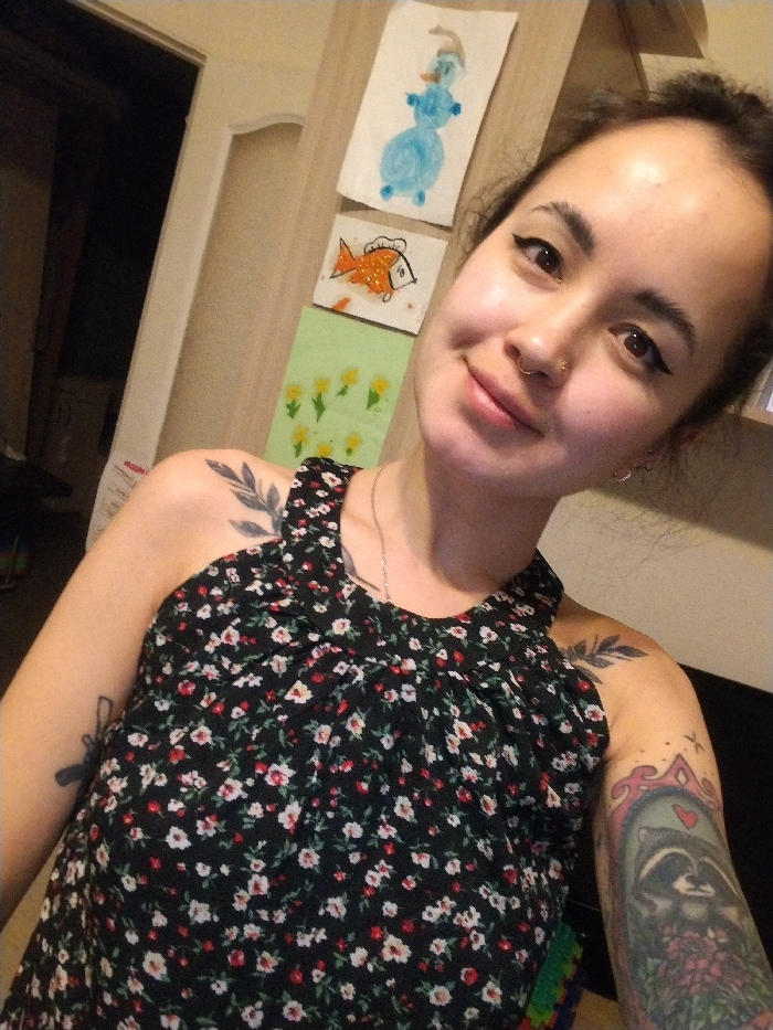An individual, identified as female, poses for a photograph in an indoor setting within the city of Unknown, Unknown. She has dark hair, winged eyeliner, a septum piercing, and small hoop earrings in her left ear. Tattoos are visible on both shoulders: a dark leaf design on her right and a large, colorful image of a crowned raccoon holding flowers on her left upper arm. She wears a black floral sleeveless top with small white and red flowers and a thin silver-colored necklace. She is smiling slightly, looking directly towards the camera. The background consists of a light-colored wall or door displaying three children's drawings: a blue snowman, an orange fish, and yellow flowers on a green background. A dark doorway and a light-colored doorframe are visible to the left. A multicolored object is partially visible at the bottom edge of the frame.