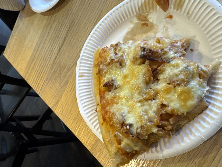 - "A partially consumed slice of pizza, topped with melted white cheese, red sauce, and various cooked meat pieces (likely chicken), rests on a white, ridged paper plate" by FM-9wXCm1, licensed under CC BY 4.0