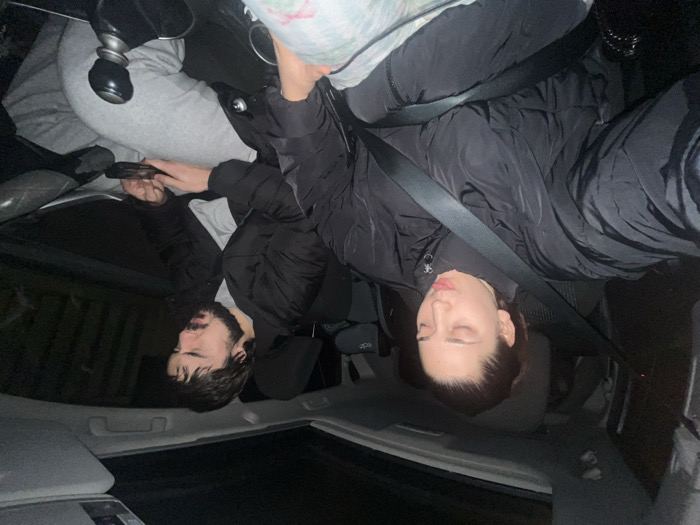 Inside a car, a woman with dark hair and a black jacket wears a seatbelt. Next to her, a man with a beard also wears a black jacket and holds a phone. Another person in grey sweatpants sits in the front passenger seat. The car's ceiling and interior elements are visible. The photo has been rotated, making the scene appear upside down.