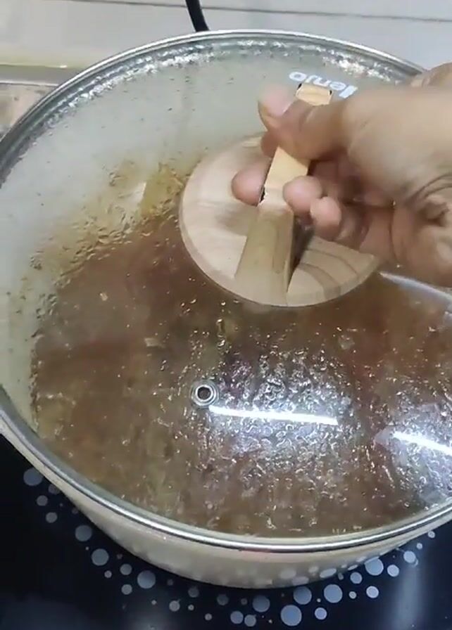 A person lifts the lid of a white pot with a glass top to reveal a bubbling stew of beef, tomatoes, and potatoes. A wooden spoon is used to stir the stew, and a close-up shows the ingredients and sauce mixing together. The cooking pot is on a black electric stovetop. The kitchen counter can be seen in the background.