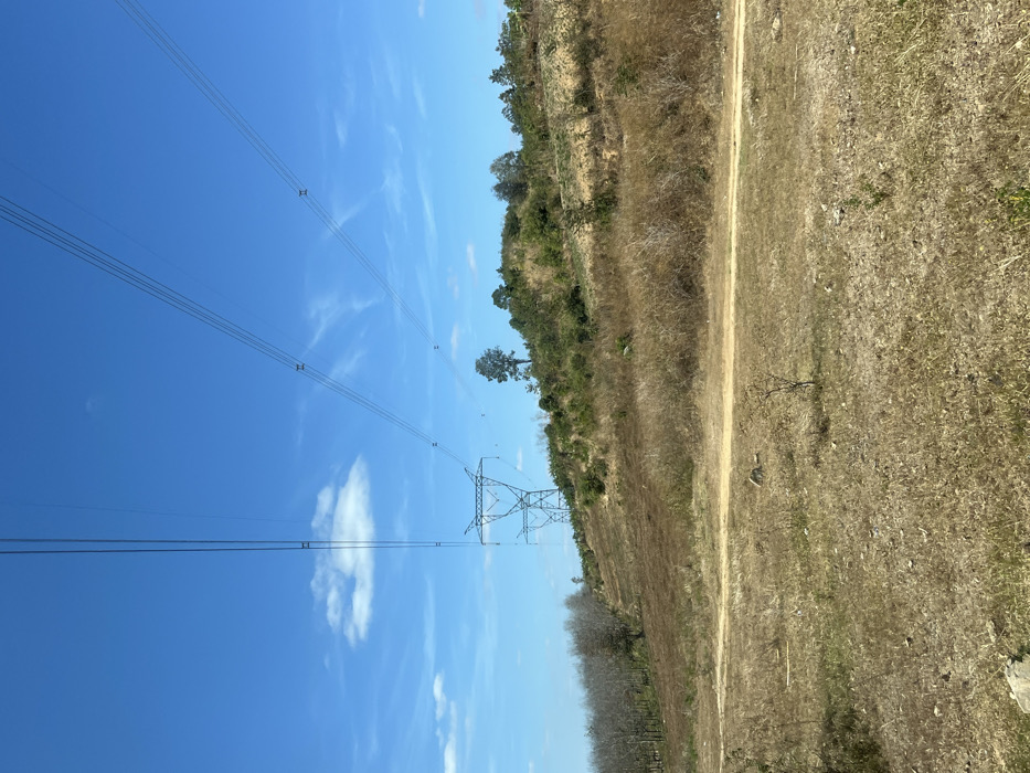 A landscape featuring a dirt path running alongside a dry, grassy hillside dotted with trees and shrubs. Overhead, high-voltage power lines stretch across a clear blue sky with scattered clouds, supported by a metal transmission tower. The image has a natural, rural feel with the focus on power infrastructure integrated within the environment.