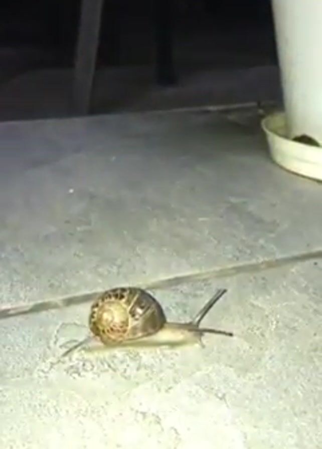 snail crawling on a tiled surface, with a potted plant in the background. The snail is moving slowly and leaving a trail of slime behind it. A table leg can be seen in the background along with the silhouette of an unknown person. The lighting is dim, and the focus is primarily on the snail.