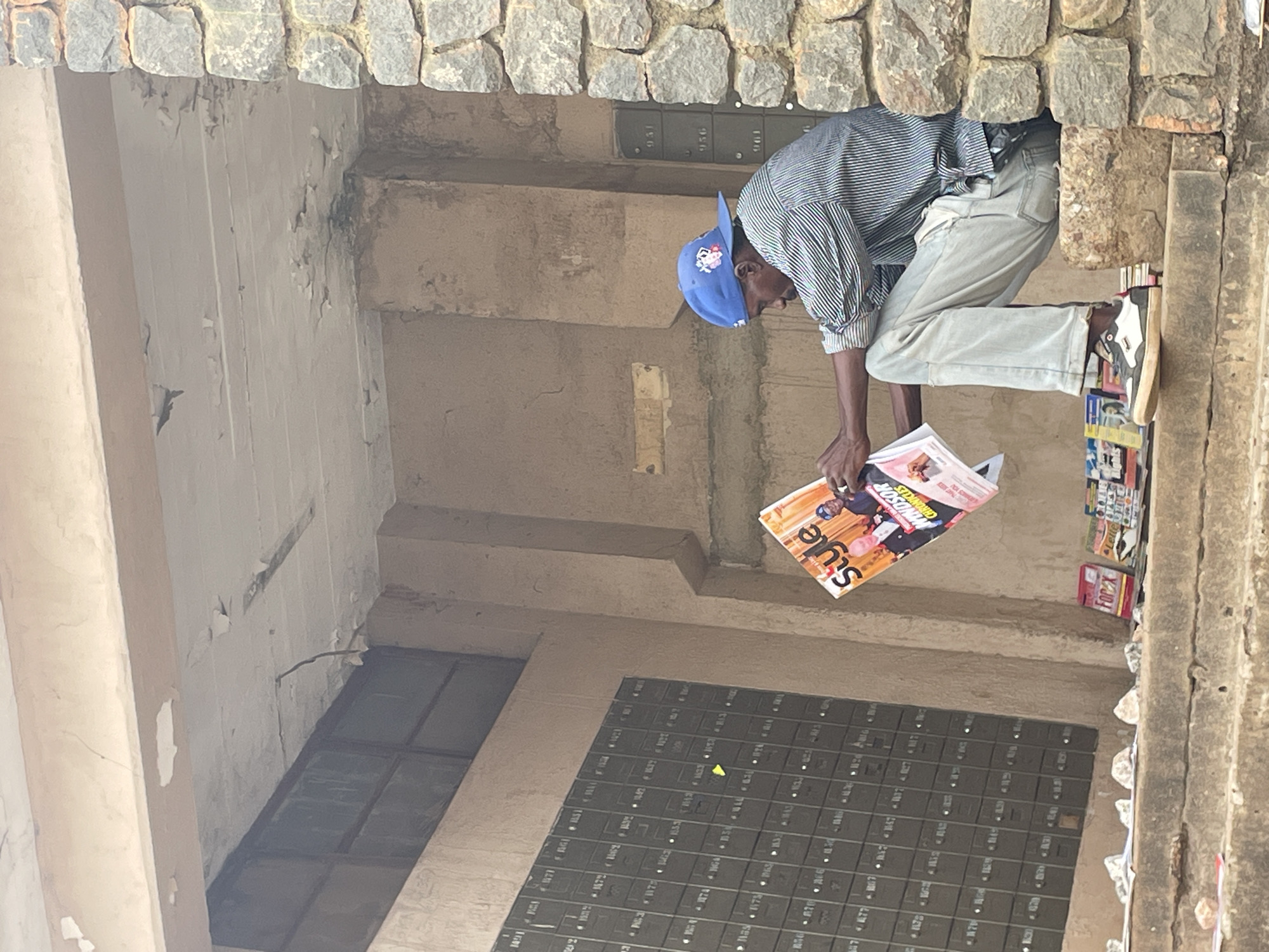 A man, dressed in a blue baseball cap, a striped long-sleeved shirt, and light jeans, sits on a rough-hewn stone block at what appears to be a post office in Jos, Nigeria. He holds a "Style" magazine, displaying its cover, which features multiple individuals and the visible text "WINDSOR CHRONICLES." Several other magazines, including one titled "Forex," are arranged for sale on the concrete steps directly in front of him. Behind the man, a wall is dominated by numerous rows of numbered metal post office boxes. The architectural environment consists of both dressed stone and concrete structures, with the overhead concrete showing signs of significant deterioration, including peeling paint and visible cracks.