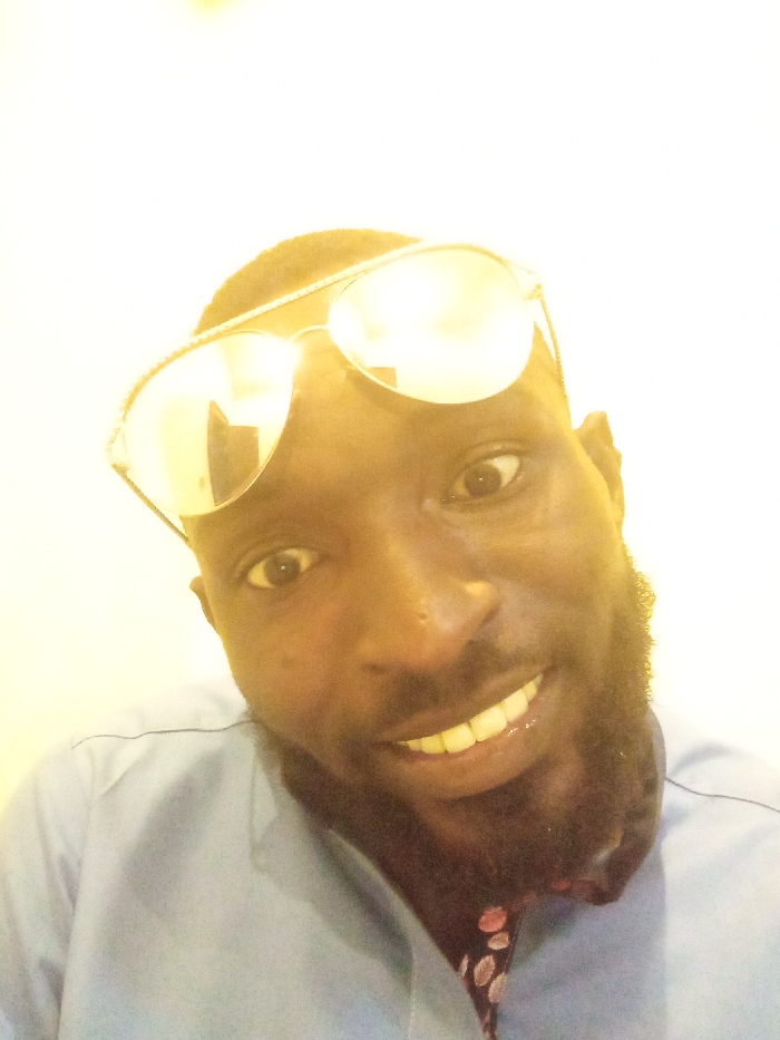 A dark-skinned man with a beard smiles at the camera, wearing sunglasses perched on his head. The glasses have mirrored lenses. He's wearing a light blue collared shirt, revealing a patterned inner collar. The background is a blurred, off-white color, possibly a wall. The lighting is bright and slightly overexposed, giving the image a warm tint.
