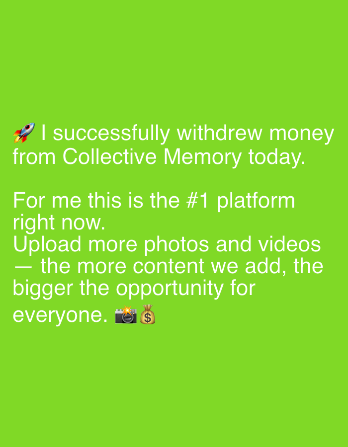This image is a digital graphic featuring white sans-serif text and emojis against a solid lime green background. The text reads: "π I successfully withdrew money from Collective Memory today. For me this is the #1 platform right now. Upload more photos and videos β the more content we add, the bigger the opportunity for everyone. πΈπ°". Emojis present include a rocket (π) preceding the first sentence, and a camera with flash (πΈ) and a money bag (π°) at the end of the last sentence. There are no visible people, physical objects, or environmental elements. The image provides no visual information regarding a specific physical location, including any location within the city of Sofia, Bulgaria.
