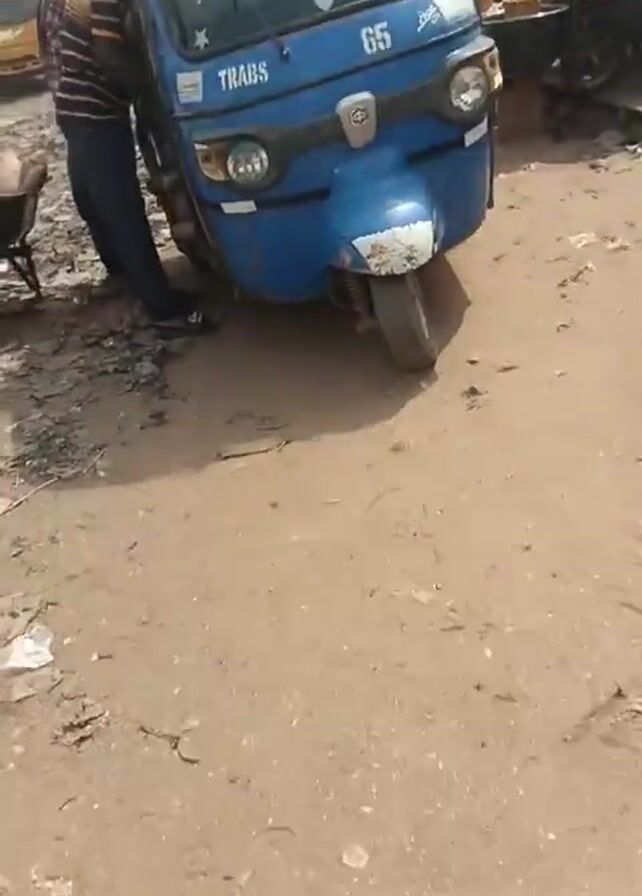 blue tricycle parked in a crowded, dirty outdoor market. The tricycle has the words "MY GOD" on its windshield and the number "65" displayed on its front. A man in a striped shirt stands near the tricycle, possibly interacting with it. Beside the tricycle is a wheelbarrow filled with yams. The ground is covered in dirt and scattered debris. Other people can be seen walking around in the background, along with more tricycles and market stalls.