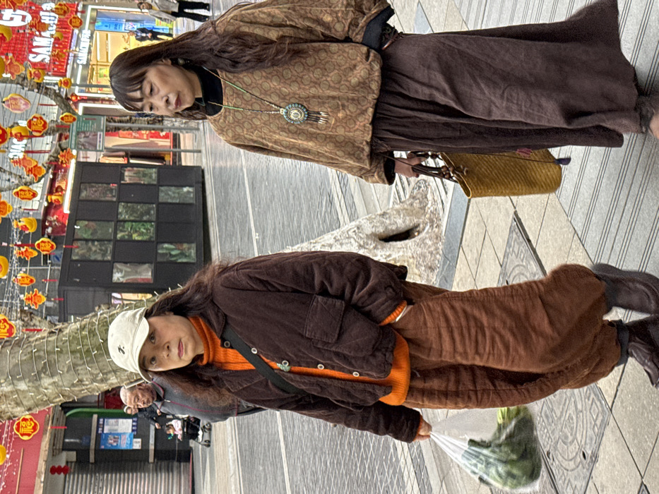 The image depicts a pedestrian street scene in Beibei, China, characterized by an urban environment adorned with festive decorations. Two East Asian women are walking from right to left in the foreground. The woman on the left, of middle to older age, has long, wavy dark hair and wears a beige baseball cap, a bright orange turtleneck sweater, a dark brown quilted jacket, and loose-fitting rust-brown trousers with dark boots. She carries a white plastic bag containing green vegetables in her left hand and has a black crossbody bag strap across her chest. A silver-colored bracelet is visible on her right wrist. Her gaze is directed towards the viewer with a neutral expression. The woman on the right, also of middle to older age, has long, straight dark hair with bangs. She wears a black turtleneck under a loose-fitting, patterned brown top, a long dark brown skirt, and dark footwear. A prominent long necklace with multiple beads and a circular pendant featuring turquoise accents hangs around her neck. She carries a woven mustard-yellow tote bag in her right hand and looks towards the right side of the frame. In the background, other pedestrians are visible, including an older East Asian man in a grey jacket and a child in a stroller to the left. The street is paved with square tiles. A large tree trunk with exposed, light-colored roots stands between the two main subjects. Overhead, numerous red and yellow lanterns are strung across the street, some displaying Chinese characters such as "福" (fú - good fortune) and "春" (chūn - spring), indicating a celebratory atmosphere, possibly during Chinese New Year. Storefronts line both sides of the street, with a dark, segmented structure on the left and illuminated shop signs, including "SAMACHI PRO," visible on the right.