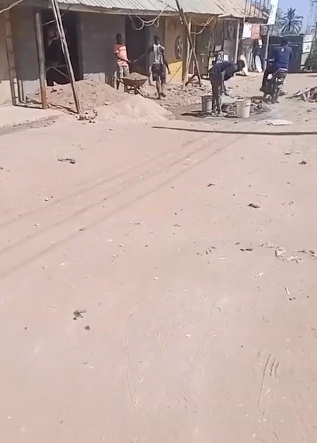 n unpaved street scene with construction underway on a building to the left. Three men are visible involved in the construction: one is using a wheelbarrow to transport materials, another is working near a pile of sand, and the third is mixing materials in a bucket on the ground. A motorcyclist passes by on the right side of the frame. The area appears dusty, and there are power lines overhead. Other buildings are visible in the background, along with various debris and objects scattered around the street.