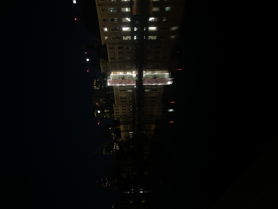 The image depicts a nighttime scene of the Hofvijver (Court Pond) in The Hague, Netherlands. The sky above is dark and clear. A row of multi-story buildings, consistent with traditional Dutch architecture, lines the far bank of the pond, with their facades illuminated by internal and external lights. Approximately central within the row of buildings, one structure is prominently encased in brightly lit scaffolding, adorned with large, vertical red banners. Its reflection is clearly visible in the calm water of the Hofvijver below, alongside the reflections of adjacent buildings and their illuminated windows. To the right, additional multi-story buildings with illuminated windows are visible. To the left, the buildings recede into darker areas, with the silhouettes of trees and more distant, taller modern high-rise buildings featuring scattered lights and red warning lights on their rooftops or cranes visible against the horizon. The surface of the Hofvijver is dark, serving as a mirror for the city lights, showing distinct reflections. No individuals or active movements are discernible within the frame. The primary light sources are artificial building and construction lights.