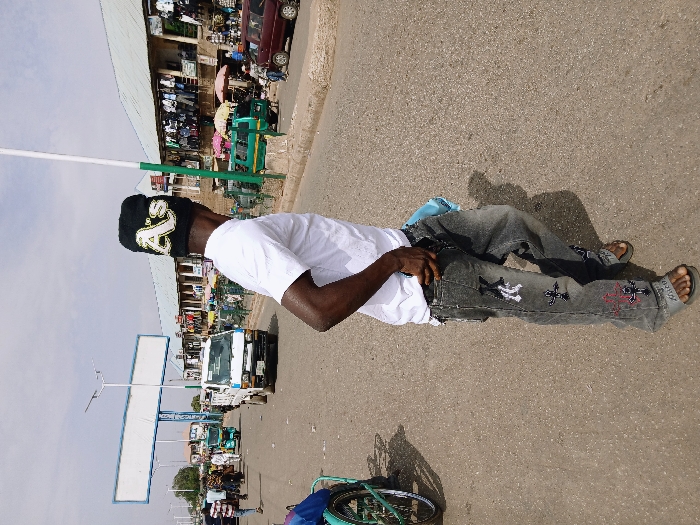 A daytime street scene in Masvingo, Zimbabwe, features a dark-skinned male in the foreground, viewed from his right side and facing away from the camera. He wears a black beanie with a yellow 'A's' logo, a plain white short-sleeved t-shirt, and dark grey baggy jeans with white 'X' designs and multiple embroidered cross motifs in black, red, and white. He wears open-toed sandals, and his right hand is at his front right waistband, with a light blue fabric piece tucked into his left waistband. The scene includes a paved road surface extending into the mid-ground. On the left, a partial view of a green bicycle is visible. Further down the road, a light-colored pickup truck travels or is parked, and an empty large white billboard on blue poles with solar panels is prominent. Numerous pedestrians are present further along the road. The right side of the image is dominated by a long, single-story market building with a corrugated metal roof. Various merchandise, including clothing, is displayed both hanging from the upper level and on ground-level stalls. Several green vans/minibuses and a red car are parked adjacent to the market building. Multiple pedestrians are seen interacting with the market. The sky is clear and bright.