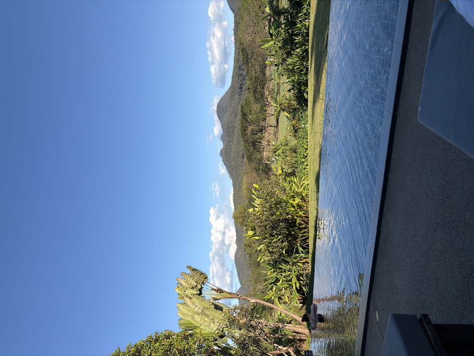 The image displays an outdoor infinity-edge swimming pool at a resort in Pai, Thailand. The foreground features dark-colored textured paving, with cropped sections of two dark lounge chairs visible at the bottom left and right. The infinity pool, tiled with dark blue or black mosaic, contains clear water with ripples, reflecting the overhead sky. One individual, with dark hair, is partially submerged in the left section of the pool, facing away from the camera, with only their head and shoulders visible. Beyond the pool, a manicured green lawn transitions to dense tropical vegetation, including a prominent traveler's palm on the left and various large-leafed plants. In the midground, a wide expanse of green land, consistent with a golf course or cultivated fields, is visible with scattered trees. The background is dominated by a range of forested mountains. The sky is bright, clear blue with scattered white cumulus clouds near the horizon. The scene is illuminated by natural sunlight, indicating daytime.