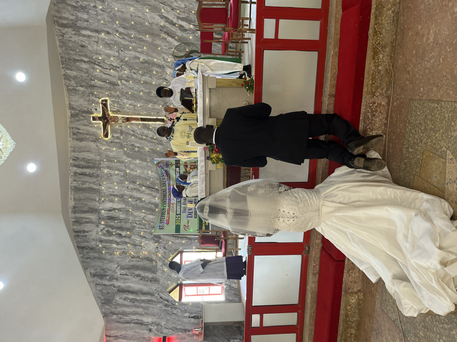 The image depicts a Catholic church ceremony occurring within the city of Ajikemai, Nigeria, specifically identified by a banner as taking place in the St