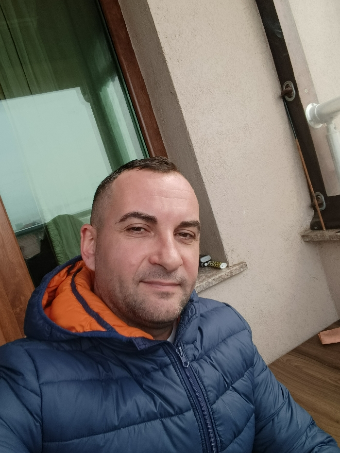 A mid-adult male with short dark hair and light stubble is depicted in a close-up photograph. He is wearing a dark blue puffer jacket with a visible orange lining inside the hood, and is looking directly at the camera with a neutral expression. The background suggests an outdoor or semi-outdoor setting on a balcony or terrace in Burgas, Bulgaria. To the left, a brown-framed window or glass door reflects a muted sky and interior elements. To the right, a light-colored, textured wall is visible. A narrow stone ledge behind the subject's right shoulder holds a small object resembling a lighter with a black and yellow pattern, next to another small metallic object. Further right on the wall, dark vertical elements with two rusted metal rings are present, along with a silver-colored pipe. A wooden surface is partially visible in the lower right corner.
