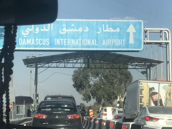 The image depicts a daytime scene on a multi-lane road leading to Damascus International Airport, consistent with a location such as Shab'a, Syria
