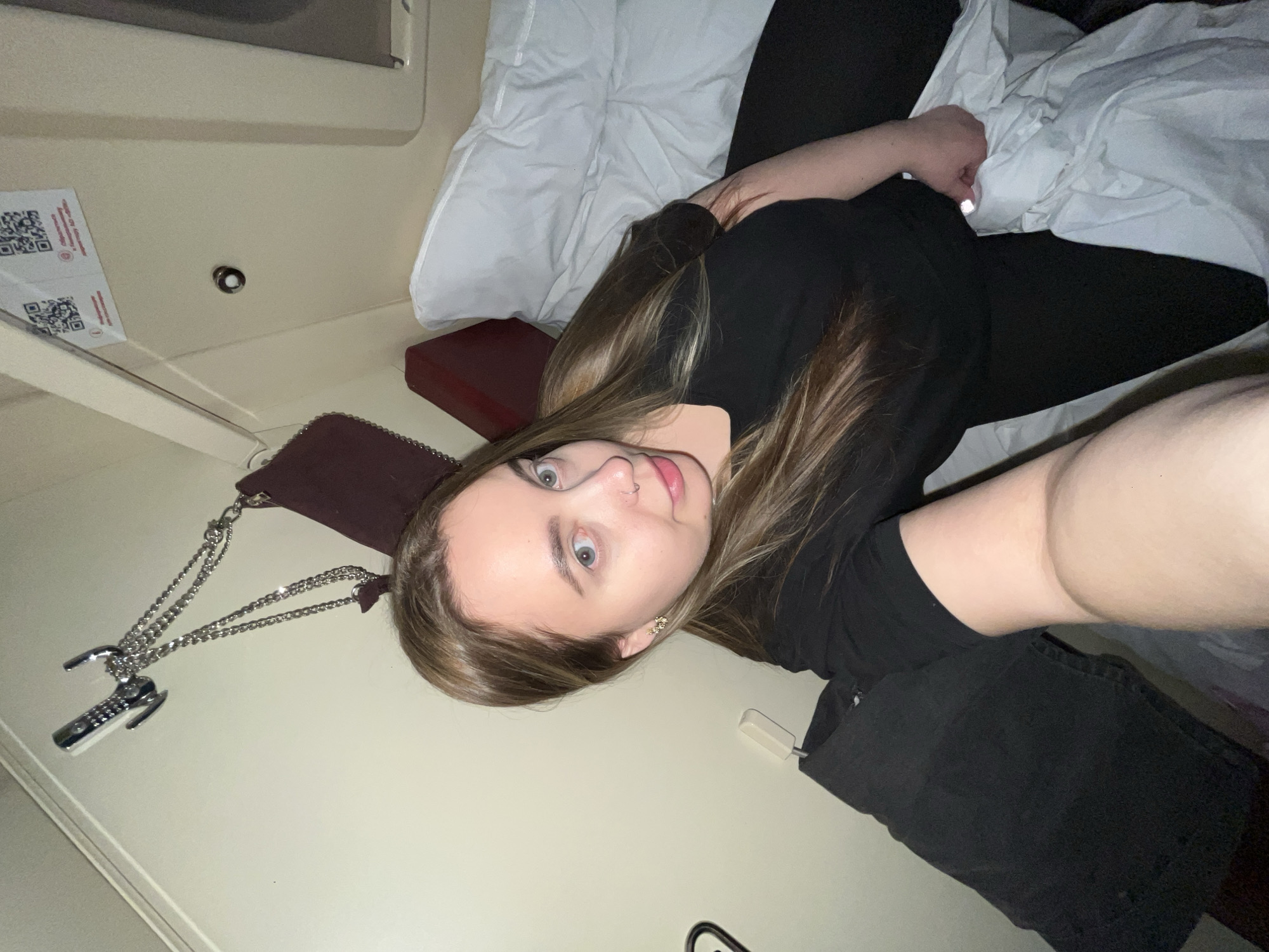 A young woman is lying on a bed in what appears to be a train compartment in Malaya Purga, Russia. She is wearing a black shirt and black pants. Her light brown hair is partially covering her left shoulder and falling towards the viewer. She is looking directly at the camera. There is a burgundy-colored purse hanging on the wall to her left. The bed has white linens. Above her is a window and a wall with a white surface and a QR code, and a small, round light fixture. The lighting is dim.