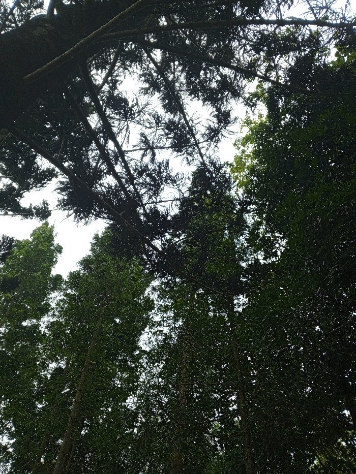 Looking up through a dense forest canopy, dark branches laden with spiky leaves spread against a bright, overcast sky. Tall, slender tree trunks rise upwards, their foliage creating a dark green mosaic. Some leaves are lighter, catching glimpses of light, while others are deeply shadowed. The overall impression is of a lush, overgrown environment, typical of a rainforest or mature woodland.