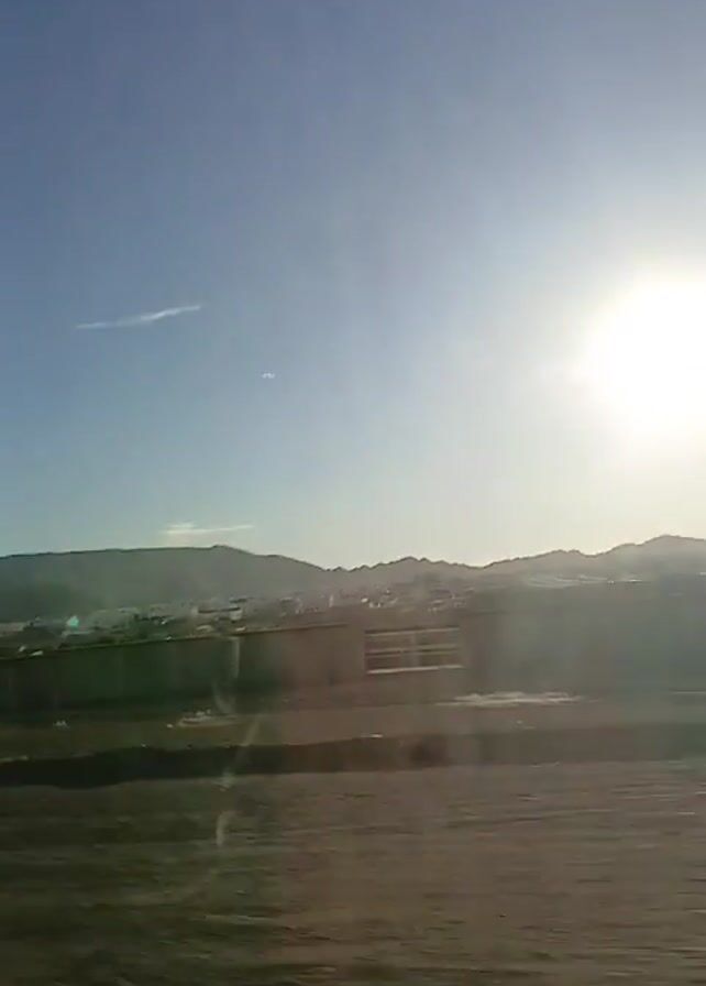landscape viewed from a moving vehicle. In the background, there is a mountain range under a clear blue sky with the sun shining brightly. In front of the mountains, there appears to be a town or settlement with buildings visible. A concrete barrier separates the settlement from what looks like a dry, flat expanse in the foreground. The camera's motion suggests that the scene is being viewed from a vehicle moving along a road or track.