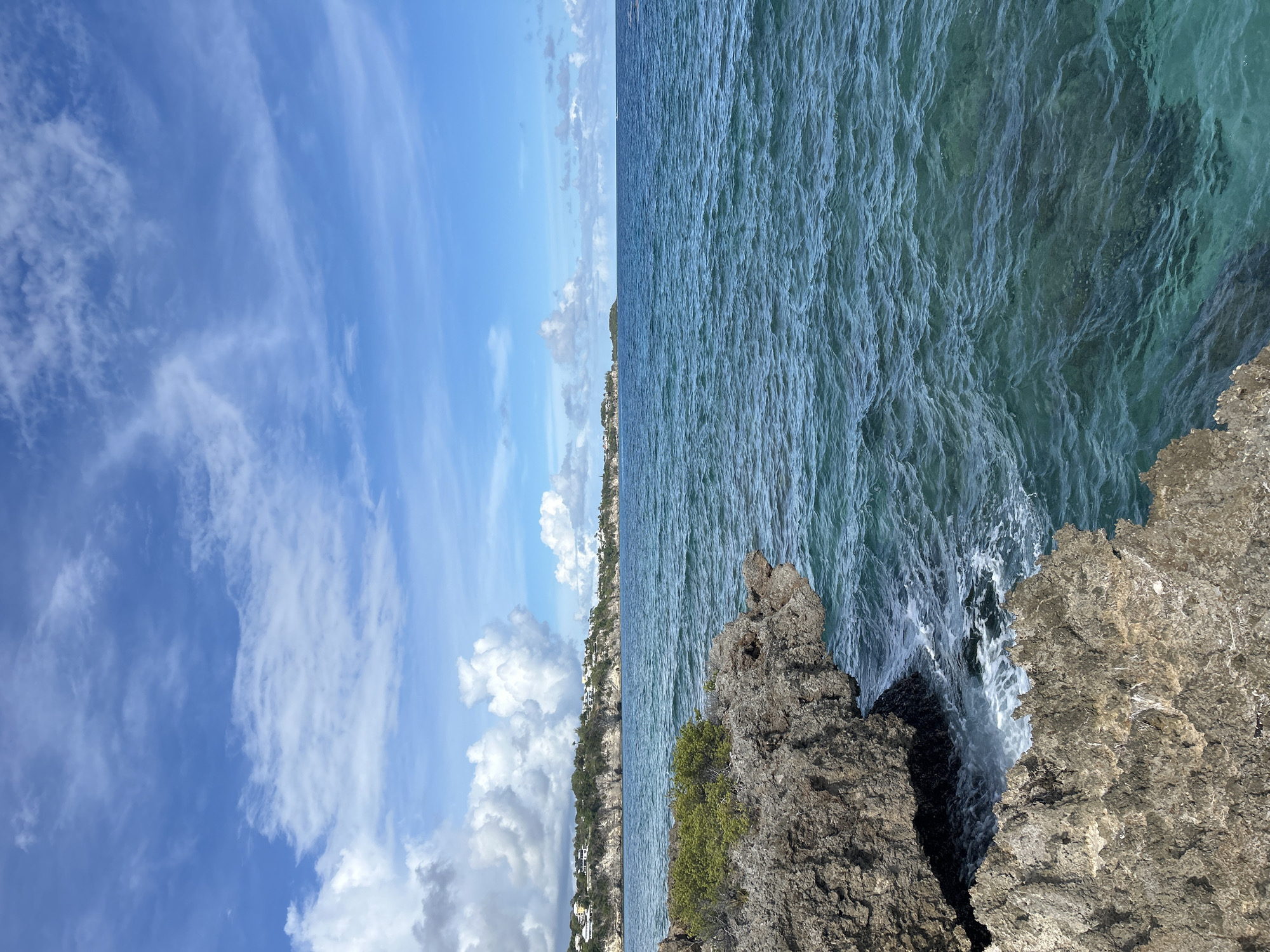 The image depicts a coastal scene in Le Gosier, France. A rocky cliff occupies the foreground, its gray texture suggesting volcanic origin. Sparse green vegetation clings to its surface. Adjacent to the cliff, the ocean's turquoise water displays dynamic patterns of waves and foam, indicating active surf. In the distance, the Le Gosier coastline is visible with buildings interspersed among trees. The sky is a vibrant blue, punctuated by scattered white clouds, enhancing the impression of a sunny day. The image appears to be a sideways photo from the vantage point of an observer situated atop the cliff.
