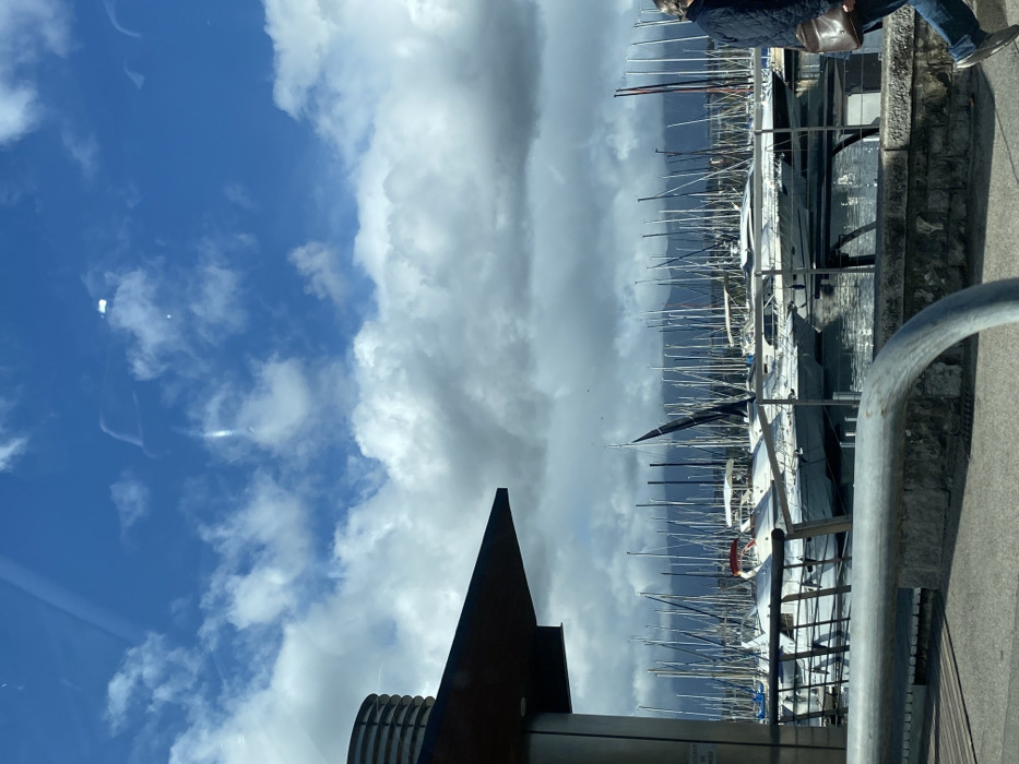 The image captures a marina scene in Cologny, Switzerland, under a sky exhibiting both clear blue patches and extensive white and grey cumulus cloud formations