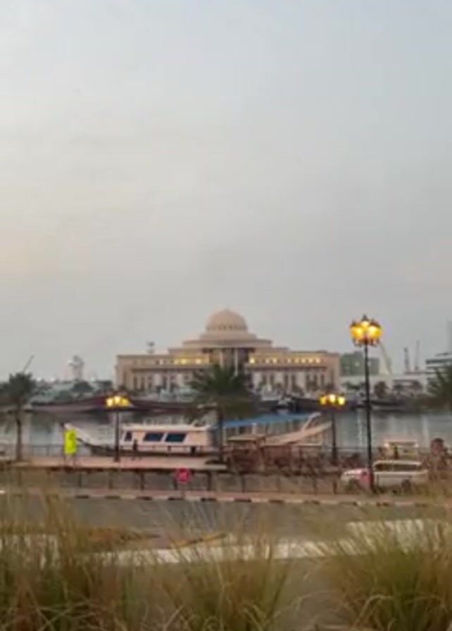 building with a dome in the distance, across a body of water. There are boats on the water and street lamps lining the pathway in front of the water. Tall grass grows in the foreground. Cars are driving on the street in front of the water. The sky is overcast.