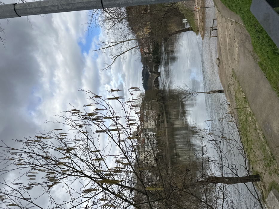 An outdoor scene shows a river reflecting a cloudy sky and nearby buildings. A bare tree with dangling seed pods is in the foreground. A stone bridge spans the water in the distance. A path runs along the riverbank with grass visible on one side. Part of a metal pole or structure is in the upper left corner. The image is taken at an angle, with the scene tilted to the right.
