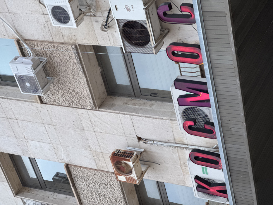 The image depicts a section of a building facade located at Cinema Kosmos in Lovech, Bulgaria. The facade is constructed from light-colored, smooth and textured concrete or stone panels. Multiple rectangular windows with dark frames are present, reflecting the environment. Four outdoor air conditioning units are affixed to the facade: one white "CANDY" unit is mounted high on the left, a heavily rusted unit is mounted below it, and two white units (one "TESLA" branded) are on the right side. Associated electrical conduits and drainage pipes are visible on the facade, connecting to the units. A prominent sign below the lower right air conditioners spells "КОСМОС" in large, dark Cyrillic capital letters with internal pink and red illumination. The illumination is uneven, particularly within the 'M' and 'C' characters. The sign is situated above a dark, horizontally-ridged overhang. No human figures are depicted.