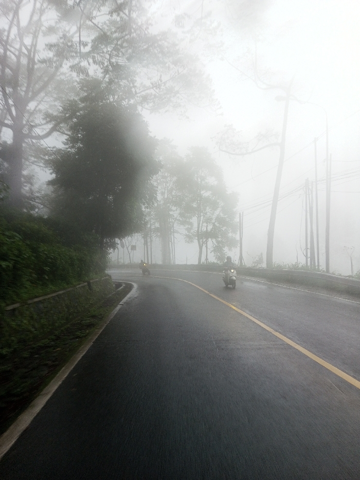 This image captures a foggy road scene in Dawathang_Dorjibi_ Kashingtsawa, Bhutan